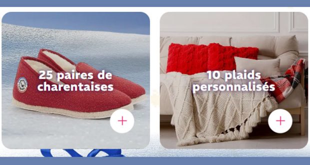 10 plaids personnalisés et 25 paires de Charentaises à gagner : Tentez de remporter 10 plaids personnalisés (valeur unitaire 120 euros), 25 paires de Charentaises (valeur unitaire 62 euros), 1 séjour d’une semaine pour 4 personnes à la montagne, forfaits de ski inclus (valeur 1000 euros).