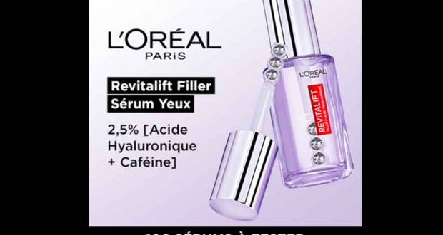 Inscrivez-vous et vous ferez peut-être partie des 100 personnes sélectionnées pour recevoir et tester ce produit. 100 sérum Revitalift Filler Sérum Yeux de L’Oréal Paris à tester