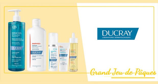14 lots de 5 soins Ducray à remporter : Chaque gagnant remportera un lot d’une valeur de 108 euros comprenant : 1 Gel moussant, 1 Keracnyl UV, 1 Keracnyl Sérum femme adulte, 1 Lotion Creastim & 1 Shampooing Anaphase.