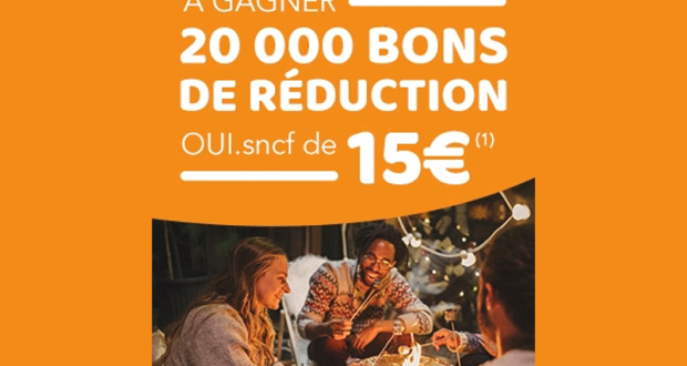 20’000 bons de réduction SNCF de 15€ offerts : SNCF vous offre 20 000 bons de réduction d’une valeur unitaire de 15 euros.