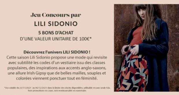 5 bons d’achat Lili Sidonio de 100 euros offerts : Jouez et tentez de gagner 5 Bons d’achat d’une valeur de 100€.