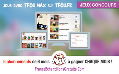 Concours 60 abonnements de 6 mois à Tfou max : Pour participer à ce jeu concours vous avez juste à cliquer sur le bouton ci-dessous, remplir le formulaire en ligne en y laissant vos coordonnées et puis répondez à des questions.