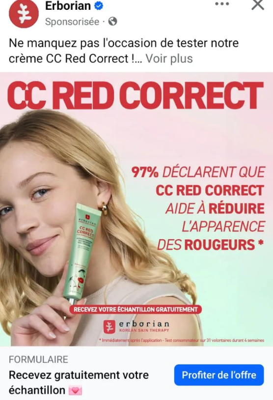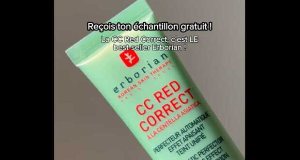 Erborian distribue des échantillons gratuits de Crème CC Red Correct sur les réseaux sociaux. Voici la marche à suivre pour accéder à la publication sponsorisée de l’offre d’échantillon :
