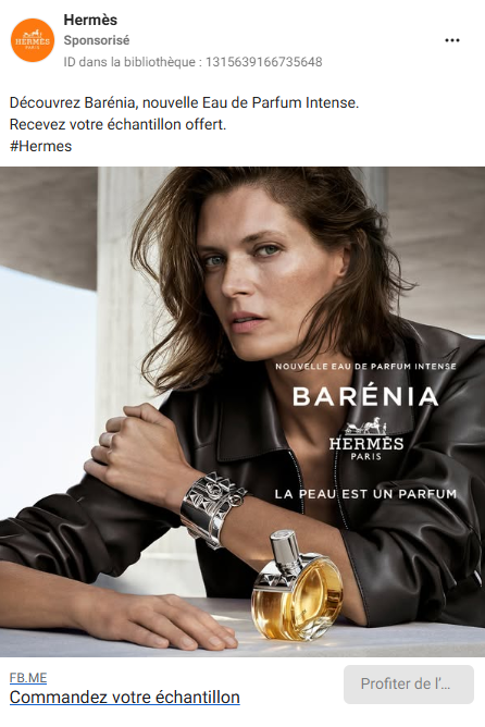 Hermès lance une campagne d’échantillons gratuits sur les réseaux sociaux via un post sponsorisé afin de découvrir le Parfum Barénia et de le tester gratuitement et tranquillement chez vous. Soyez parmi les premiers à tester le Parfum Barénia de Hermès Paris en commandant dès maintenant vos échantillons gratuits !