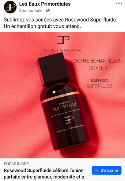Les Eaux Primordiales vient de débuter une nouvelle campagne d’échantillonnage sur les réseaux sociaux via un post sponsorisé. Les personnes qui s’inscrivent reçoivent sous quelques semaine un échantillon gratuit Rosewood Superfluide.