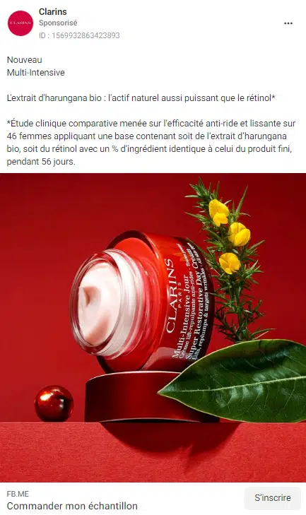 3 : Retournez sur votre fil d’actualité. Maintenant que vous êtes abonné à Clarins France, vous allez voir apparaître sur votre fil d’actualité tous les posts de la marque, et notamment la publication sponsorisée avec le formulaire à compléter pour recevoir chez vous des échantillons gratuits Soin Multi-Intensive Jour.
