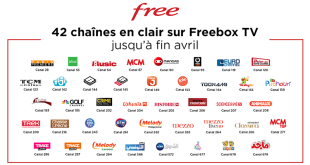 Freebox TV : 42 chaînes en clair : Free continue d’accompagner au quotidien ses abonnés pendant cette période exceptionnelle de confinement. A cette occasion, Free prolonge la diffusion en clair sur Freebox TV des chaînes Jeunesse initialement prévue jusqu’au 31 mars et rend accessible en clair jusqu’au 30 avril 2020 de nouvelles chaînes parmi lesquelles des chaînes Cinéma comme : Eurochannel, Drive in Movie Channel et TCM Cinéma.