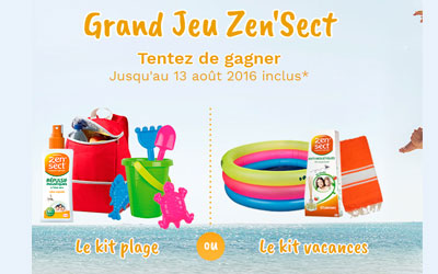 Piscine gonflable : Participez à ce jeu concours gratuit pour gagner 28 lots comportant 1 piscine gonflable + 1 fouta + 1 produit Zen’Sect au choix (valeur unitaire 45 euros), 28 lots comportant 1 jeu de plage + 1 sac à dos glacière + 1 produit au choix (valeur unitaire 42 euros).