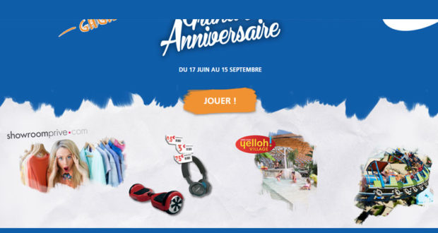 Lots à gagner : 1 séjour d’une semaine en club Yellow Village pour 4 personnes (valeur 600 euros), 1 hoverboard (valeur 600 euros), 1 casque audio Bose (valeur 240 euros), 4 chèques cadeaux Showroomprive de 240 euros (mode), 10 chèques cadeaux amazon de 60 euros, 5 entrées pour 2 personnes pour le parc Astérix (valeur unitaire 60 euros), 30 abonnements Deezer premium d’un mois.