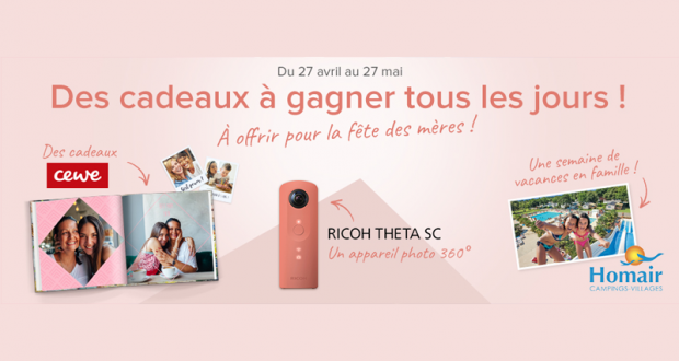 Séjour en résidence Homair Villages : Grand jeu de la fête des mères. Des cadeaux à gagner tous les jours pour la fête des mères ! Une multitude de cadeaux photo à personnaliser, un appareil photo Ricoh Theta et un séjour en famille Homair Vacances ! Alors venez gratter tous les jours pour découvrir si vous avez gagné !