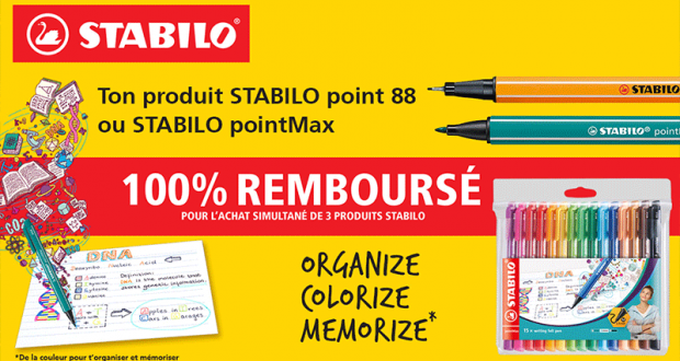 STABILO : Le 3ème produit 100% remboursé : Ton produit STABILO point 88 ou pointMax 100% remboursé pour l’achat simultané de 3 produits STABILO dont au moins 1 produit STABILO point 88 ou STABILO pointMax (dans la limite de 10€).