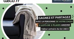 Lots à gagner : 15 lots de 2 plaids andine (valeur unitaire 280 euros). Réponse1 : 1998 Réponse2 : linge de maison Réponse3 : françaises et européennes Date limite de participation : 26/11/2017. J’en profite