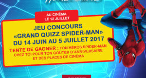 Lots à gagner : 1 goûter pour 12 à 16 enfants à votre domicile (valeur 1500 euros), 25 lots de 2 places de cinéma pour le film « Spider-Man : Homecoming ». Réponse1 : Peter Parker Réponse2 : Le vautour Réponse3 : Iron Man Date limite de participation : 05/07/2017. Bonne chance! J’en profite