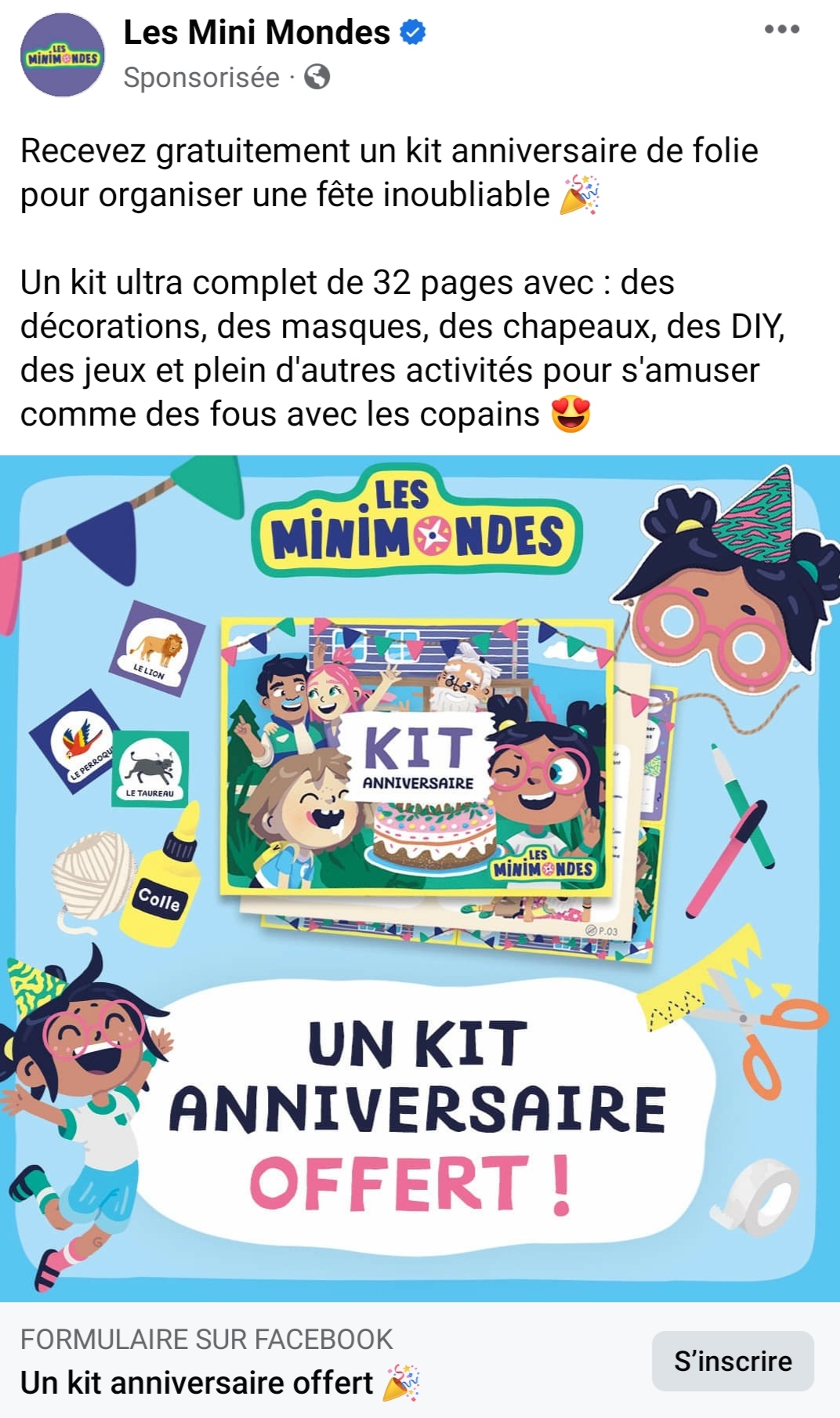 3 : Retournez sur votre fil d’actualité. Le post sponsorisé avec le formulaire à compléter pour commander votre kit anniversaire gratuit devrait s’afficher prochainement.