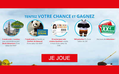 Week-ends à Londres pour 2 adultes et 2 enfants : Participez à ce jeu concours gratuit pour gagner 3 week-ends à Londres pour 2 adultes et 2 enfants (valeur unitaire 900 euros), 7 week-ends au ZooParc de Beauval pour 2 adultes et 2 enfants (valeur unitaire 466 euros), 10 abonnements de 6 mois de cinéma illimité Gaumont (valeur unitaire 159 euros), 460 peluches « Kung Fu Panda » (valeur unitaire 25 euros).